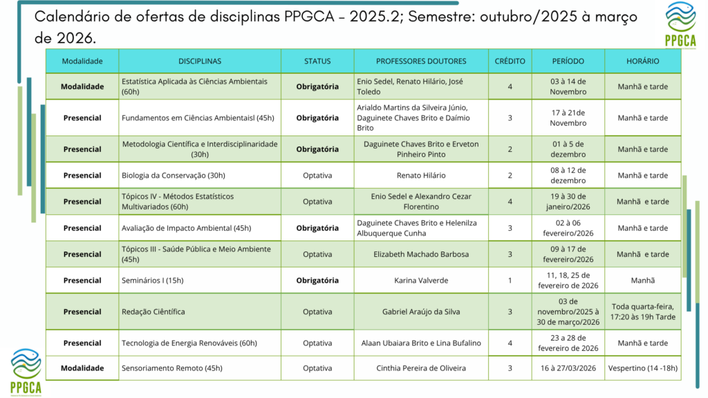 Calendário de ofertas de disciplinas 2025.2 Autor do post:ppgca Post publicado:18 outubro, 2025 Categoria do post:Sem categoria Comentários do post:0 comentário Leia mais artigos Post anteriorEM BREVE, EDITAL PPGCA 2025 Você também pode gostar SELETIVO TURMA 2024 – VAGAS REMANESCENTES 5 julho, 2024 CREDENCIAMENTO DE DOCENTES 12 outubro, 2024 📢 NOVA ESPÉCIE DE PARASITA DESCOBERTA NA AMAZÔNIA! 12 outubro, 2024 Deixe um comentário Cancelar respostaComentárioDigite seu nome ou nome de usuário para comentar Digite seu endereço de e-mail para comentar Digite o URL do seu site (opcional)